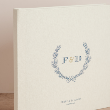 Rob and Ellie’s wedding album is a beautiful keepsake that preserves their memories while showcasing thoughtful and elegant design. The photo cover immediately draws you in with a collage of three carefully chosen photos paired with their names and wedding date. This design element sets a personal tone right from the start.