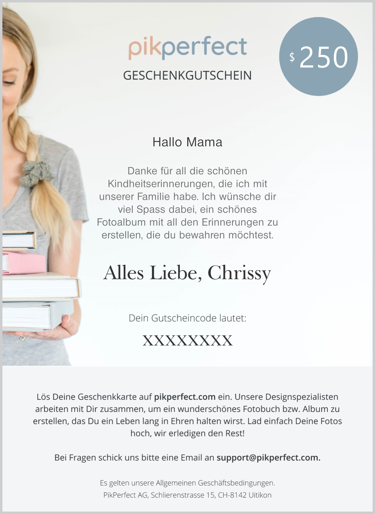 Geschenkgutscheine sind nicht erstattungsfähig und können nur auf pikperfect.com eingelöst werden. Sie sind nicht übertragbar und können nicht in bar ausbezahlt werden. Fotobuch-Geschenkkarten sind zur einmaligen Verwendung und nur in der Währung des Kaufs gültig, sie können nur für eine einzige Transaktion verwendet werden. Gutscheine können nicht für frühere Bestellungen verwendet werden.